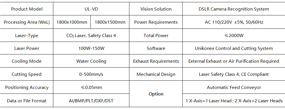 UL-VD series is a high-precision laser cutting system which equipped with DSLR camera system, plus software function could capture the whole working pieces image on cutting area via DSLR camera at a time and automatically analyze to recognize the contour, then accurately position for cutting without additional hand-works.